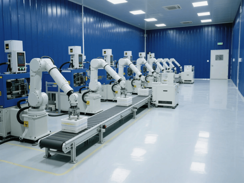 車間采用模塊化潔凈結(jié)構(gòu),50mm厚深藍(lán)抗菌彩鋼板墻體搭配圓弧收邊工藝,確保無塵死角。自動(dòng)化注塑機(jī)與機(jī)械臂工作站呈流水線布局,設(shè)備區(qū)采用淺灰不銹鋼圍擋,與深藍(lán)墻體形成鮮明對比。吊頂系統(tǒng)配置FFU高效過濾單元,維持≥25次/h換氣次數(shù),氣流組織采用頂送側(cè)回模式,確保溫濕度與潔凈度穩(wěn)定。