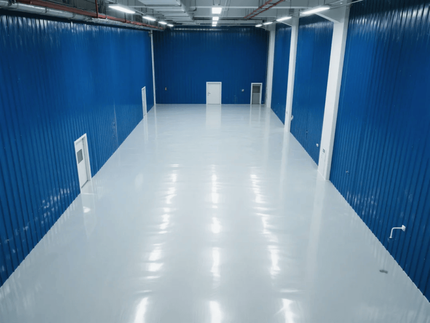 本方案以工業(yè)科技風(fēng)為設(shè)計(jì)導(dǎo)向,打造符合ISO14644-1Class7標(biāo)準(zhǔn)的智能化注塑生產(chǎn)環(huán)境。空間主體采用深藍(lán)色彩鋼板墻體與淺灰防靜電環(huán)氧自流平地坪,形成冷峻而富有科技感的視覺層次。地面系統(tǒng)電阻值穩(wěn)定控制在10^6~10^9Ω,兼具防靜電與耐磨特性,滿足精密注塑工藝需求。